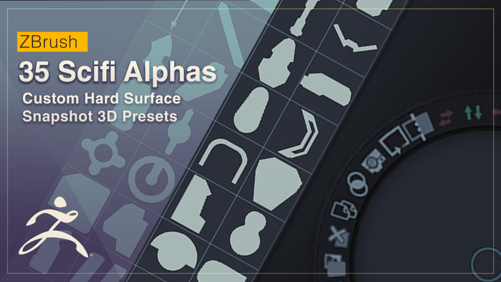 Zbrush's Snapshot 3D features allow you to quickly generate geometry from an alpha. Speed up your hard surface workflow with this custom set of 35 Scifi alphas. Included is a guide showing how to load the .ZSL file from the texture pallet in ZBrush.